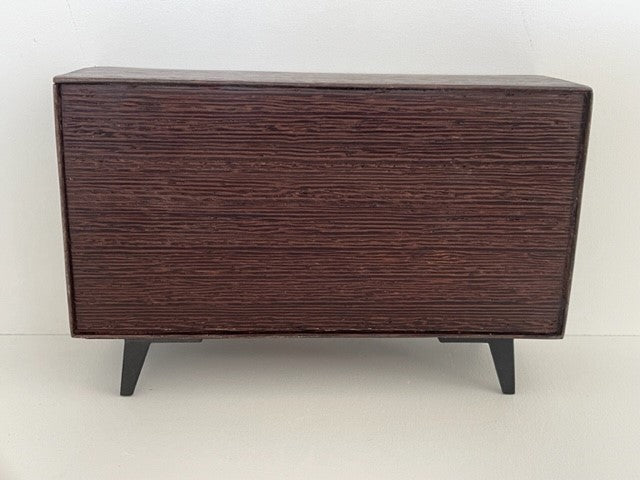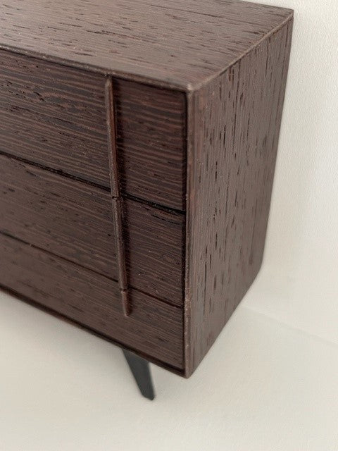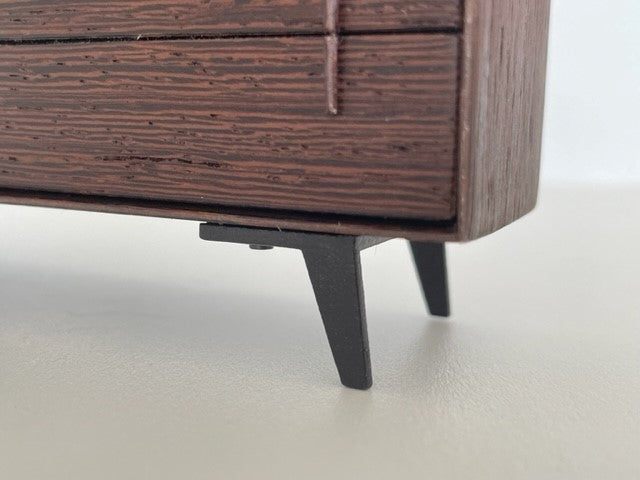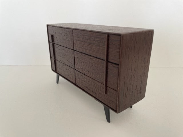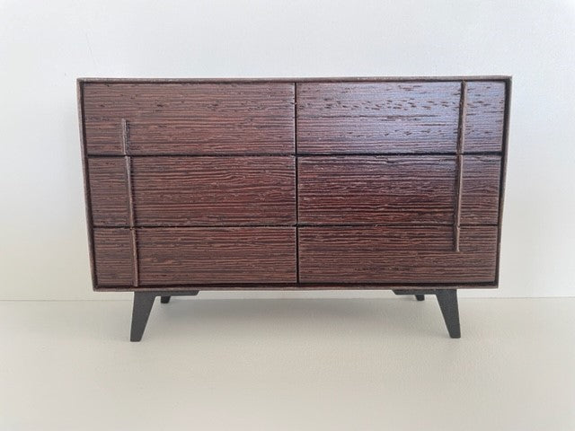 This sleek modern 6 drawer dresser has asymmetrical vertical design for drawer pulls with black angled legs. NOTE: Drawers do not open.