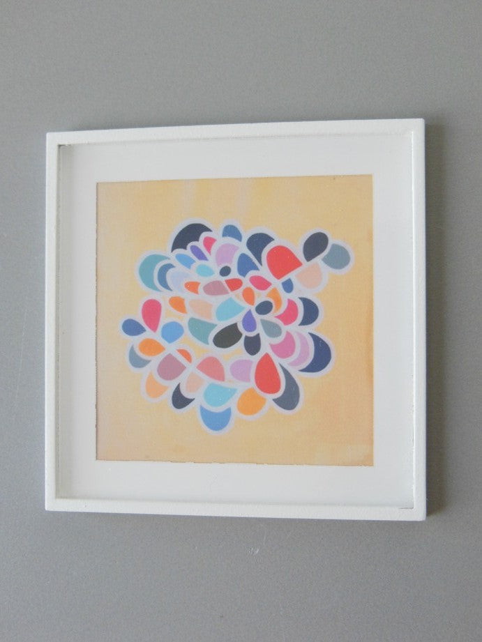 Multi-color burst abstract print on a cream back drop that is white framed with a white matte. Can be hung either vertically or horizontally.