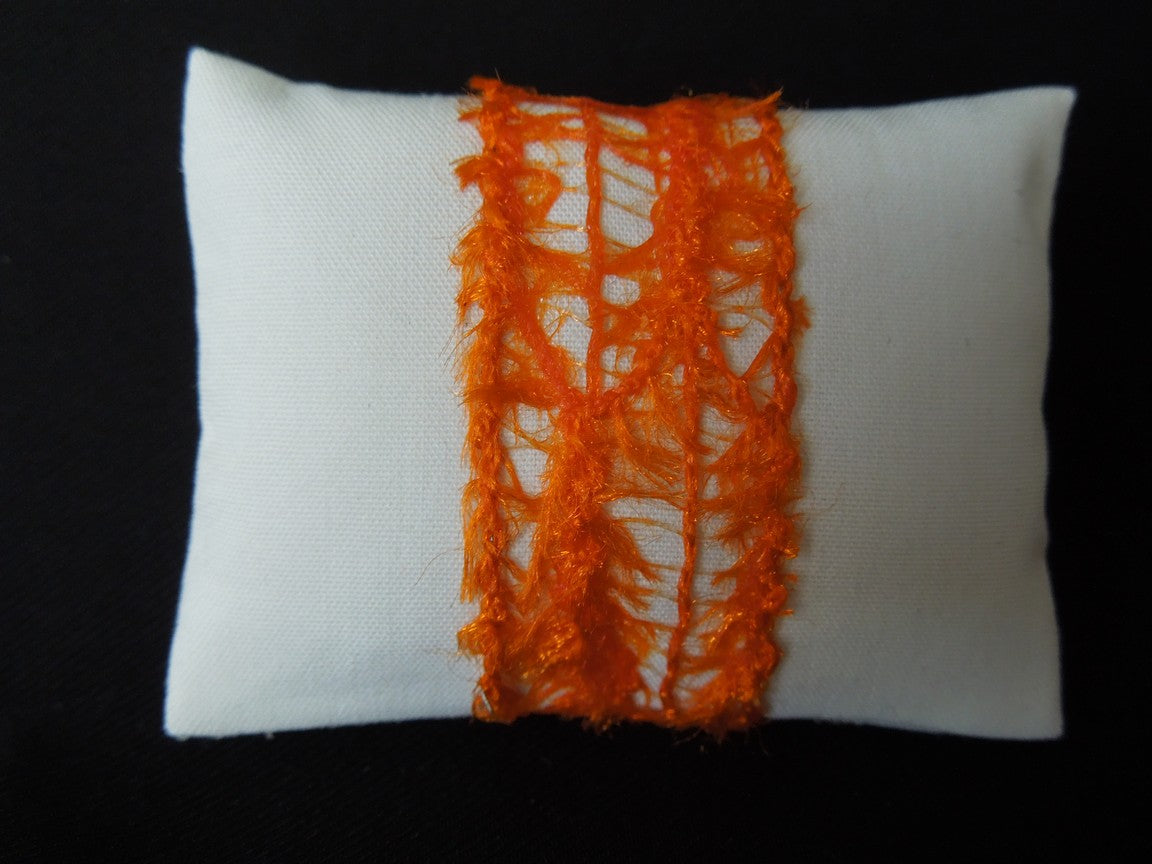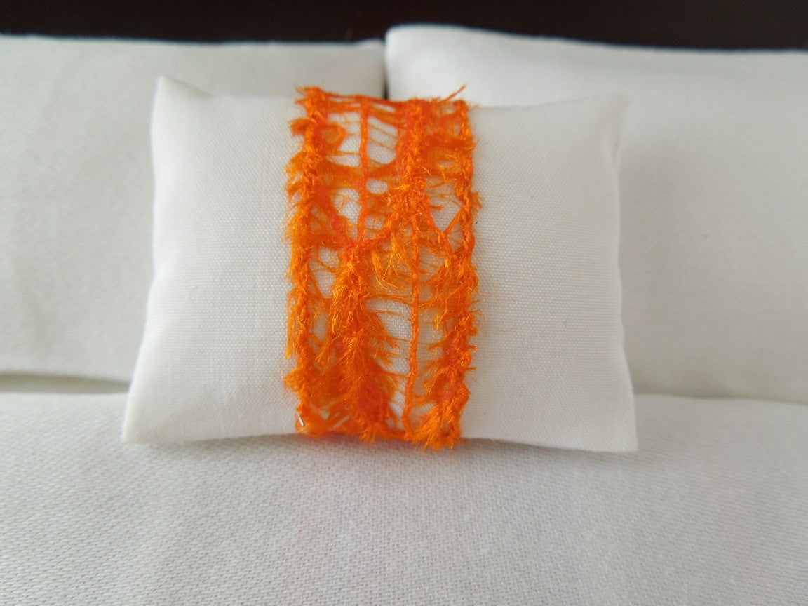 The White with Orange Band Medium Rectangle Pillow is constructed of a white cotton fabric with a wide orange fringe band.