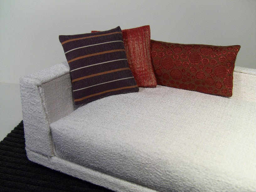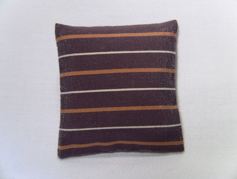 The Wisteria Medium Square Pillow is constructed of a shimmery light eggplant fabric with cream and tangerine stripes.
